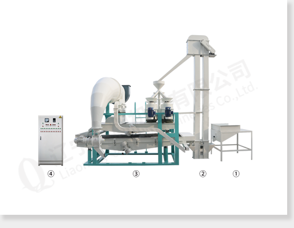 ① 上料斗② 斗式提升機(jī) ③ 脫殼、風(fēng)選、分選主機(jī) ④ 電氣控制柜