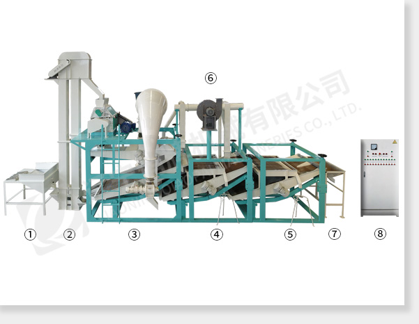 ① 上料斗② 斗式提升機 ③ 脫殼、風選、分選主機 ④ 籽米復選機1 ⑤ 籽米復選機2 ⑥ 風力回料系統(tǒng) ⑦ 接料斗 ⑧ 電氣控制柜